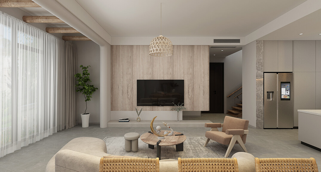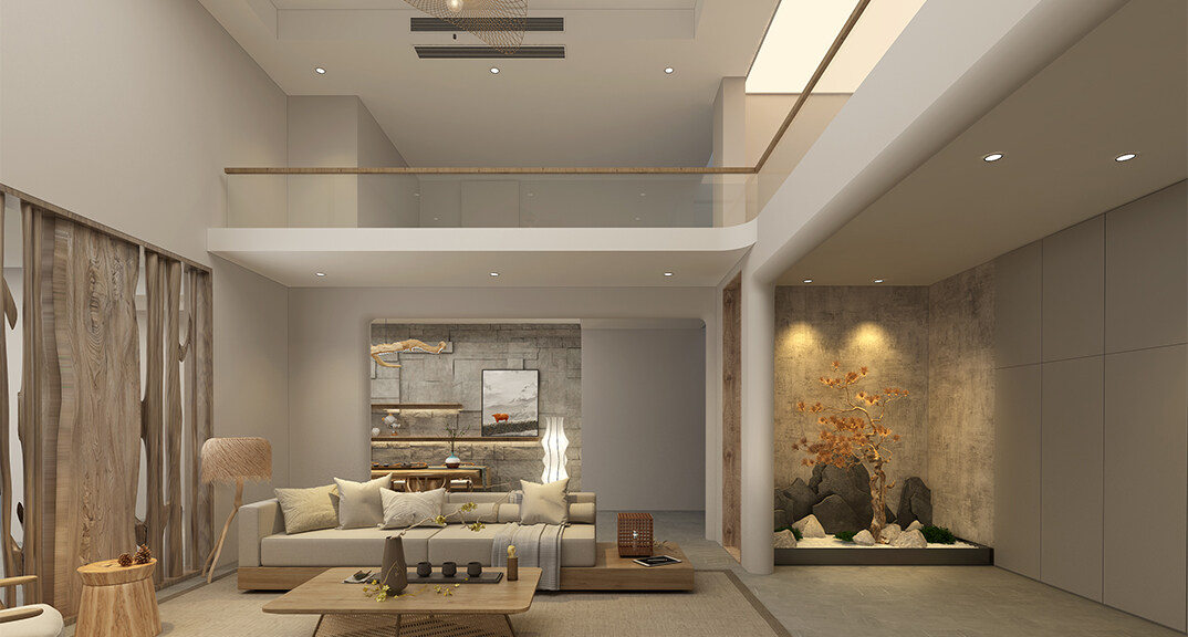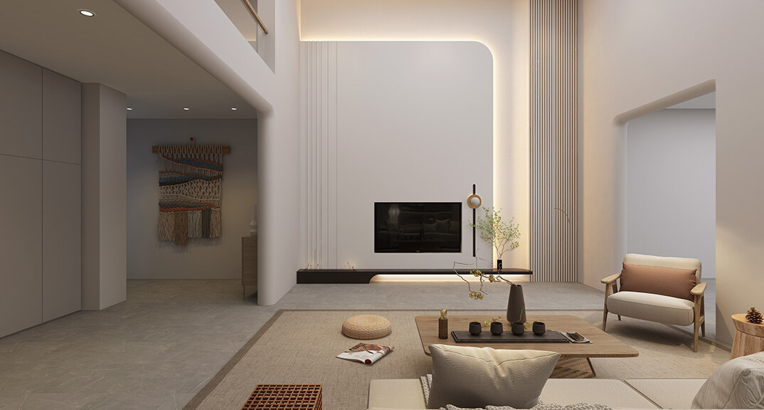 融創(chuàng)紅島壹號(hào)院207㎡別墅客廳侘寂風(fēng)格裝修案例效果圖