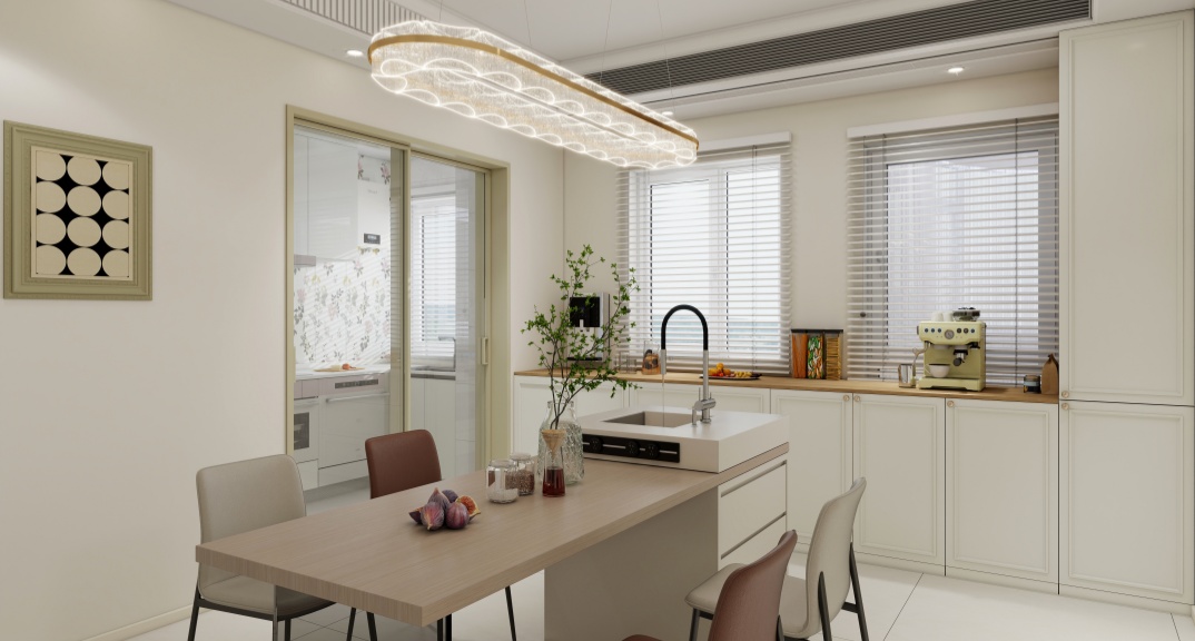 2.原來(lái)客廳區(qū)域較別扭,沒(méi)有完整電視墻及沙發(fā)墻,且客戶喜歡制作餐點(diǎn),喜歡島臺(tái)設(shè)計(jì),想要大量收納及一個(gè)西廚區(qū),現(xiàn)將原來(lái)客廳區(qū)域規(guī)劃為西廚區(qū),做了餐島一體,增加了收納功能,客廳放到原來(lái)餐廳區(qū)(及擴(kuò)出來(lái)的區(qū)域)